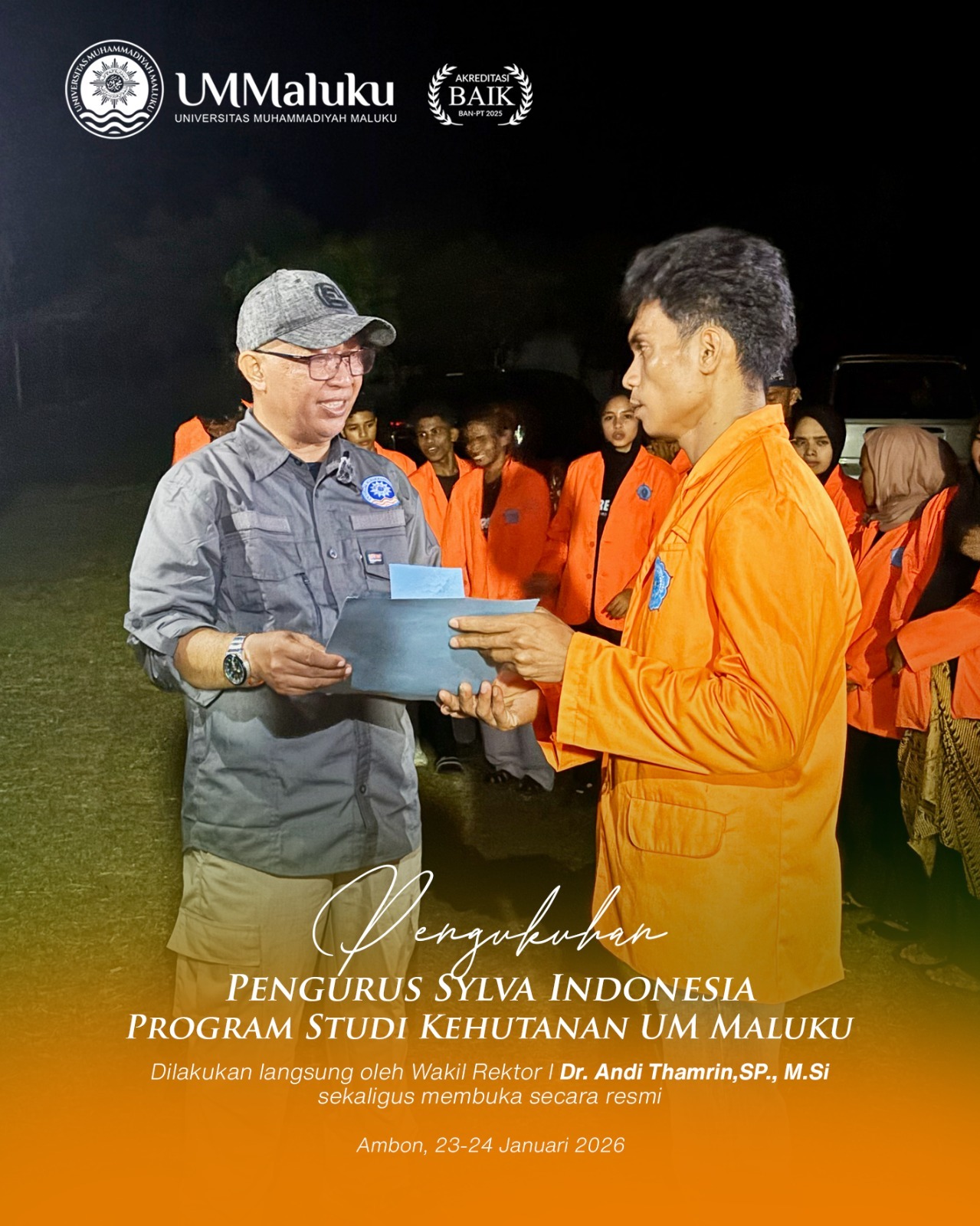 Wakil Rektor I Universitas Muhammadiyah (UM) Maluku, Dr. Andi Thamrin, SP., M.Si, resmi mengukuhkan kepengurusan Sylva Indonesia PC UM Maluku periode 2025/2027. Acara yang berlangsung selama dua hari, 23–24 Januari 2026, ini menjadi momentum krusial bagi rimbawan muda untuk memperkuat kepemimpinan hijau mahasiswa.